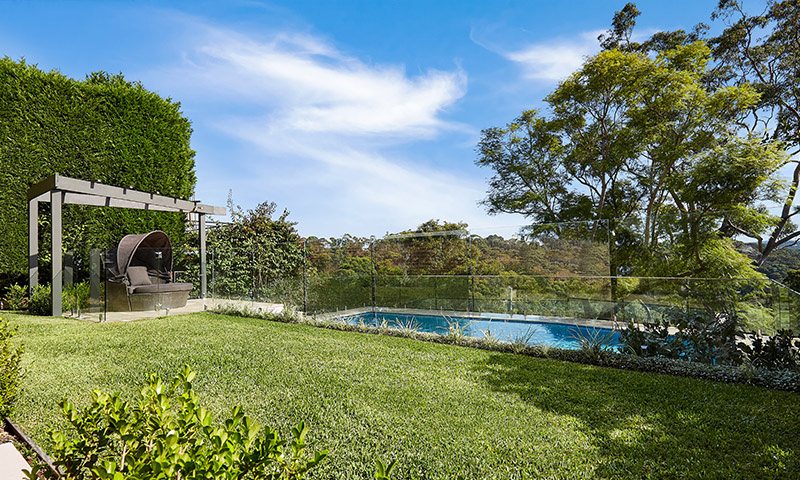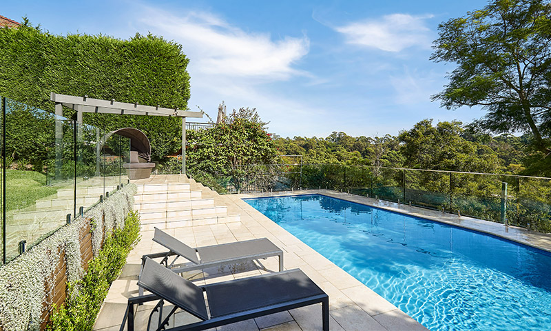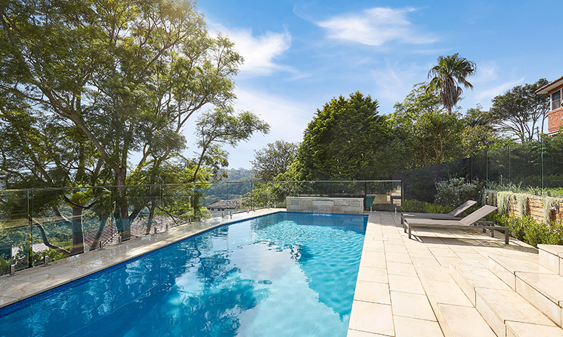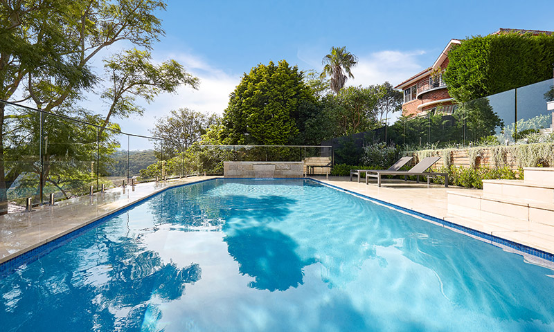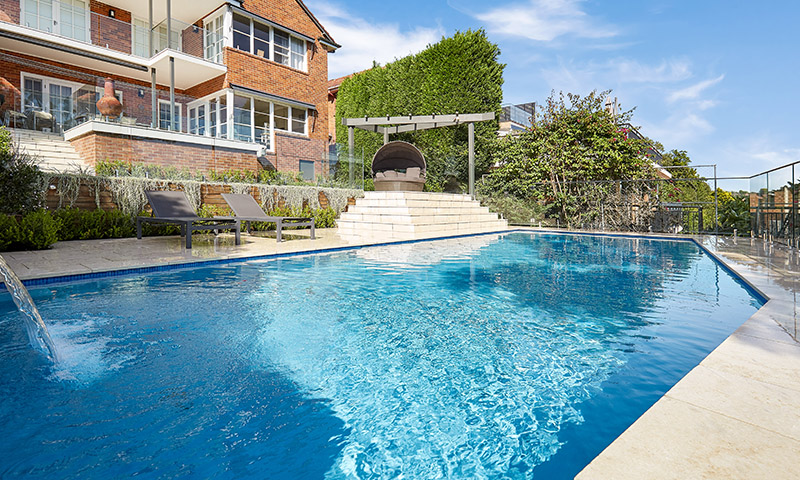 Project details: Cliffside concrete pool with hand-cut limestone coping and surrounds. Pool side cabana. House balconies tiled with limestone and glass balustrading. Enviroswim pool sanitation. Electric pool heating. Moroccan limestone pool water feature wall. Extensive garden lighting. Irrigation system. Cottage plant theme.