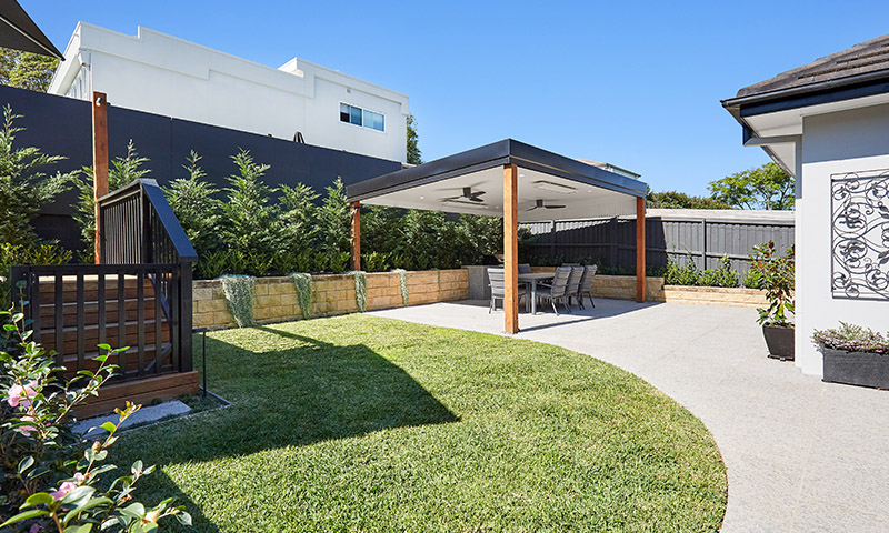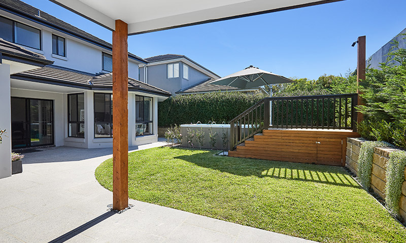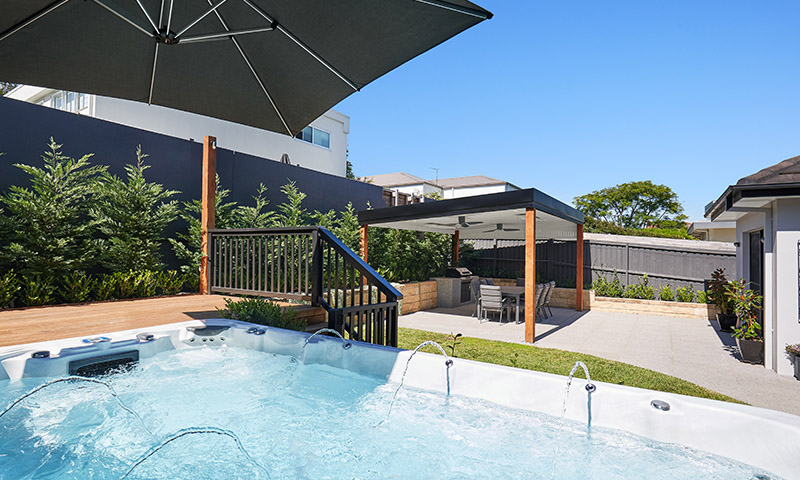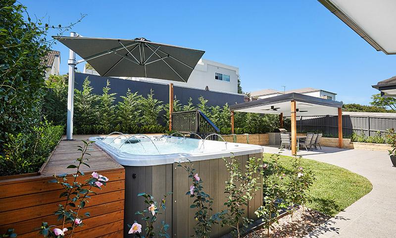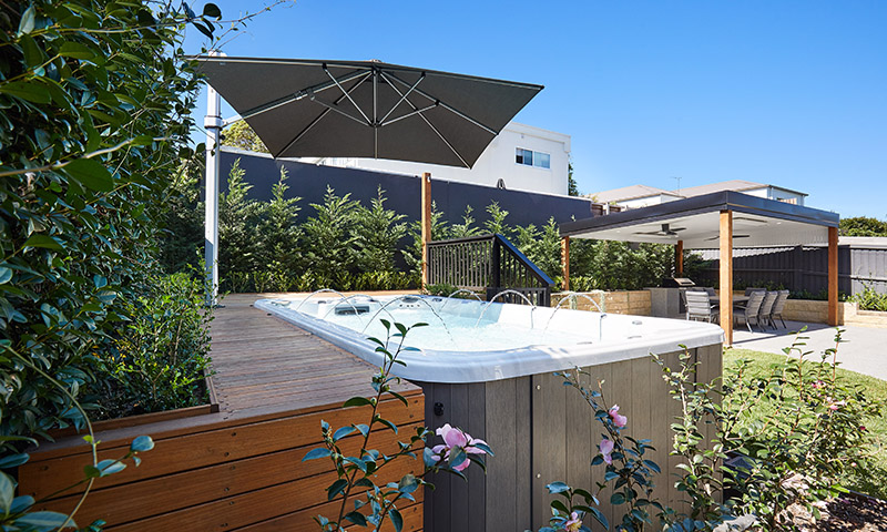 Project details: Craned in swim spa surrounded in hardwood decking. Entertaining pavilion with hardwood post, heating, fans and built in BBQ. Block retaining wall. Cottage plant theme. Outdoor lighting. Irrigation system. Cantilevered umbrella. Bluestone tiled areas.