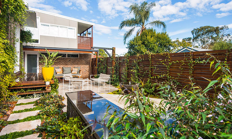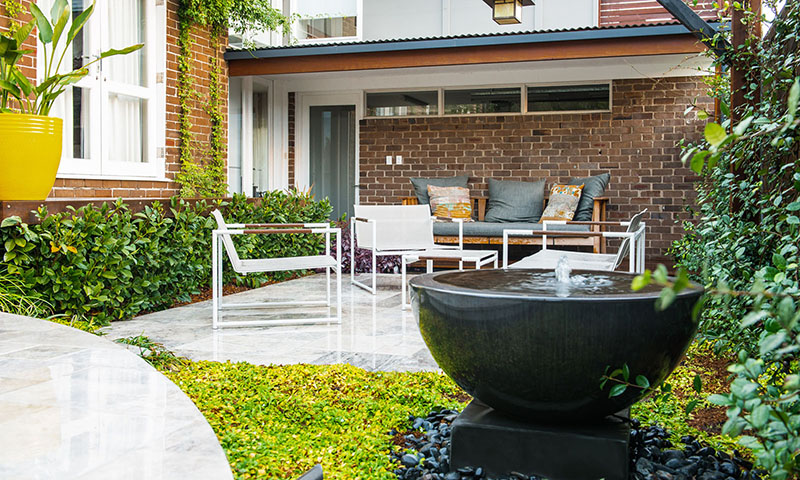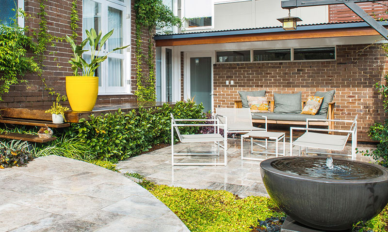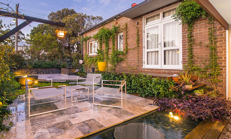 Project details: Silver Travertine tiling, Bluestone daybed, floating stepper water feature, Spotted Gum decking and screening, hardwood pergola, bespoke overhead lighting, exterior lighting, fully automated irrigation and formal geometric planting.