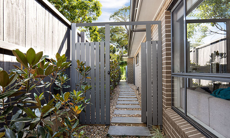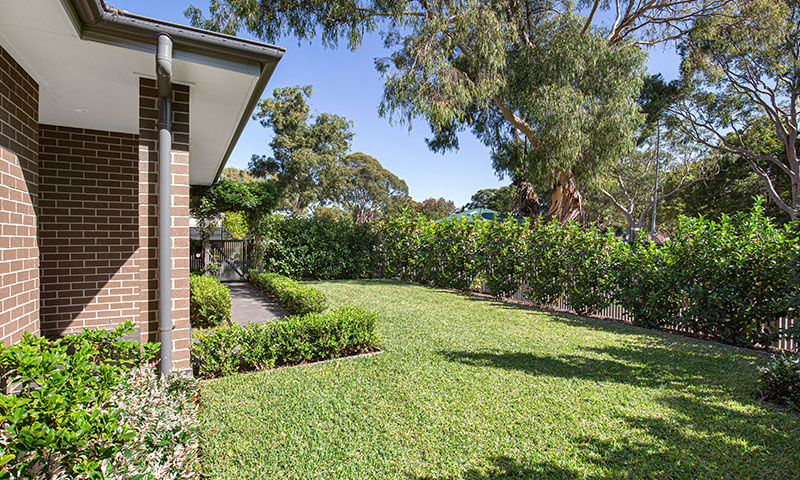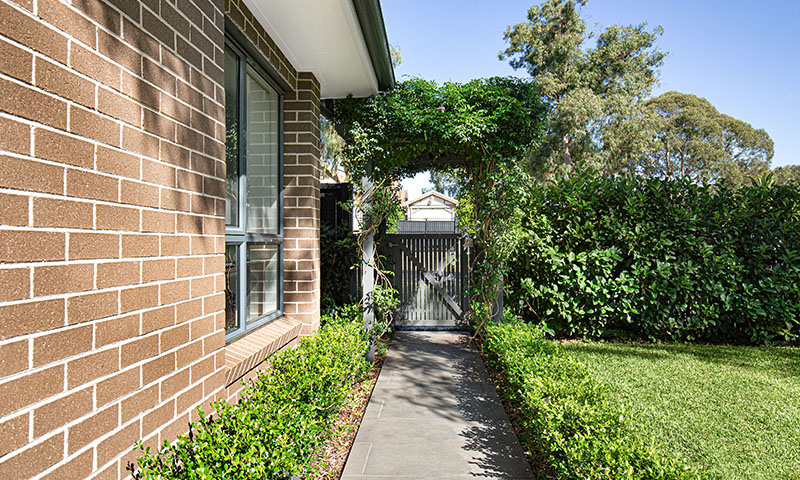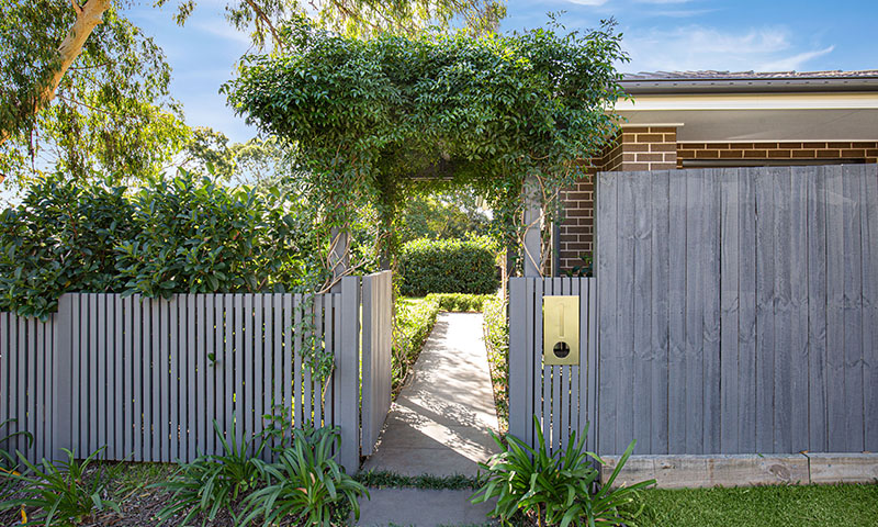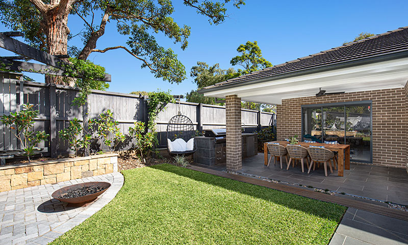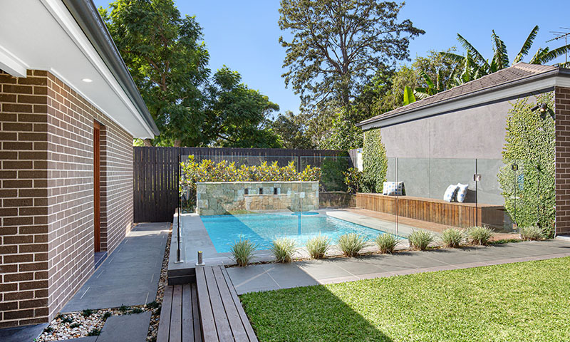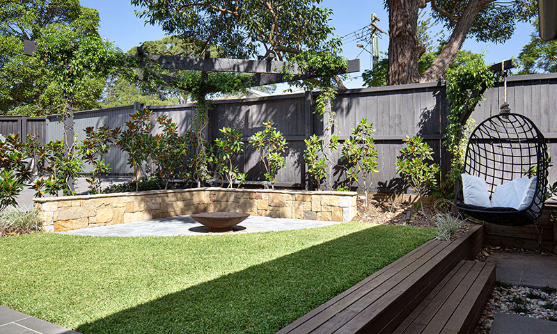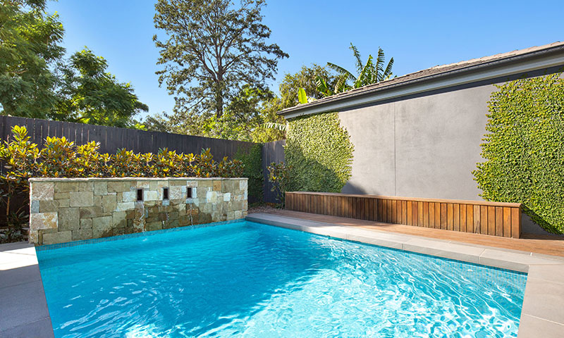 Project details: Fully tiled plunge pool. Sandstone feature wall with custom made copper spouts. Pool side timber deck with built in bench seating. Firepit with seasonal pergola and stone bench seating. Front entrance arbour. Bluestone tiling with rebated coping. Hanging chair. Built in outdoor kitchen. Landscape lighting. Cottage plant theme.